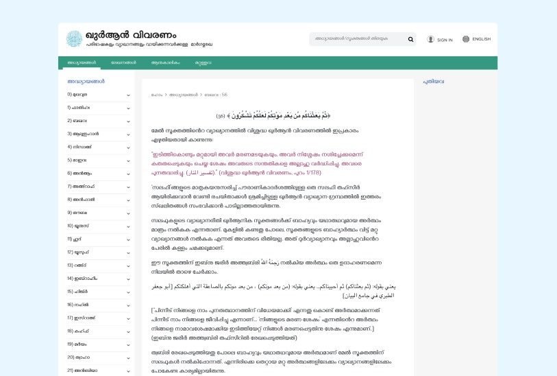A platform offering Tafseer of the Quran in Malayalam and English, providing detailed explanations and interpretations for each verse. It enables users to easily search and bookmark sections.