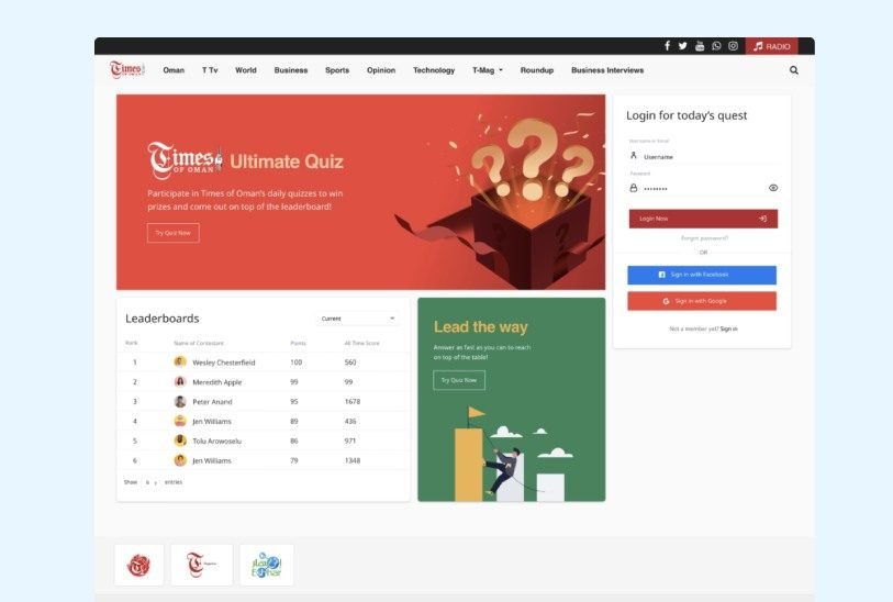 An online quiz platform designed for user engagement with daily quizzes, real-time leaderboards, and reward tracking. It features a free trial and subscription model, enabling seamless registration and participation.