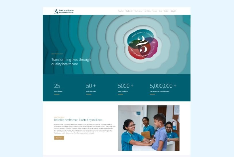 A custom WordPress CMS featuring intuitive navigation and mobile responsiveness. The design highlights corporate updates, news, business divisions, and Abeer’s brands.
