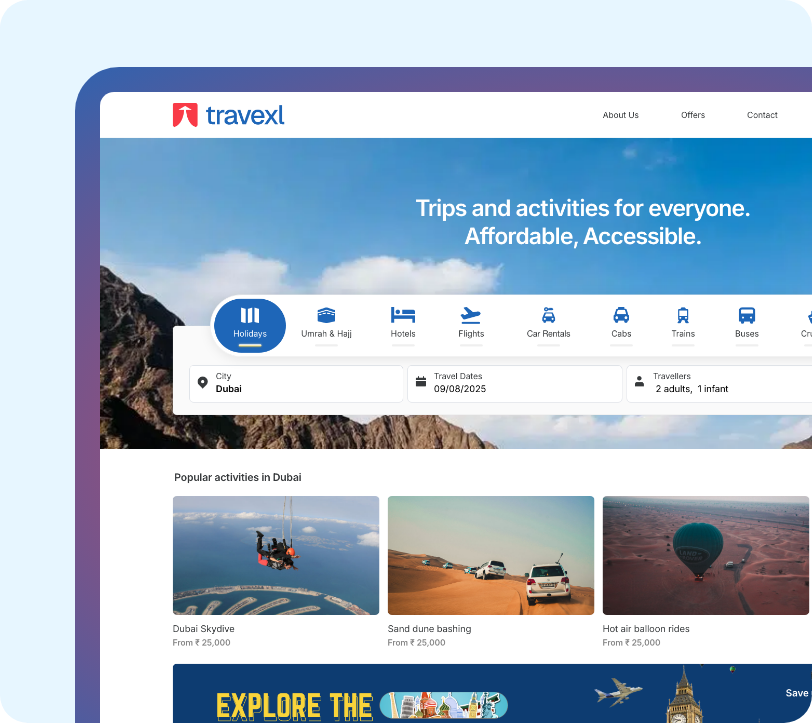 Give your travel agency a major upgrade with Travexl. It’s a complete, all-in-one platform built to handle everything you need to run a successful business. We’ve combined a powerful booking system, an easy-to-use website manager, and all your back-office tools into one simple software. Travexl helps you look more professional, get found by more customers online, and stay organized without the stress. If you’re looking to grow your business and work smarter, this is the tool for you.